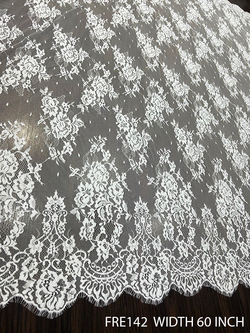 FRE142 Chantilly lace fabric featuring a delicate floral motif, 60 inches wide and sold in 3-meter dyeable rolls. Ideal for bridal gowns, couture fashion, and luxury design projects.