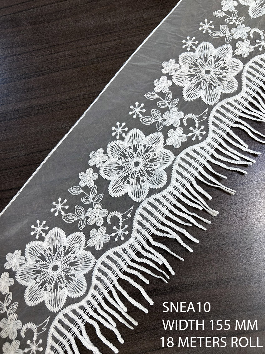 SNEA10 features a translucent poly organza base layered with delicate netting and finished with ornate GPO fringe. Ideal for statement sleeves, bridal overlays, and luxury fashion accents.