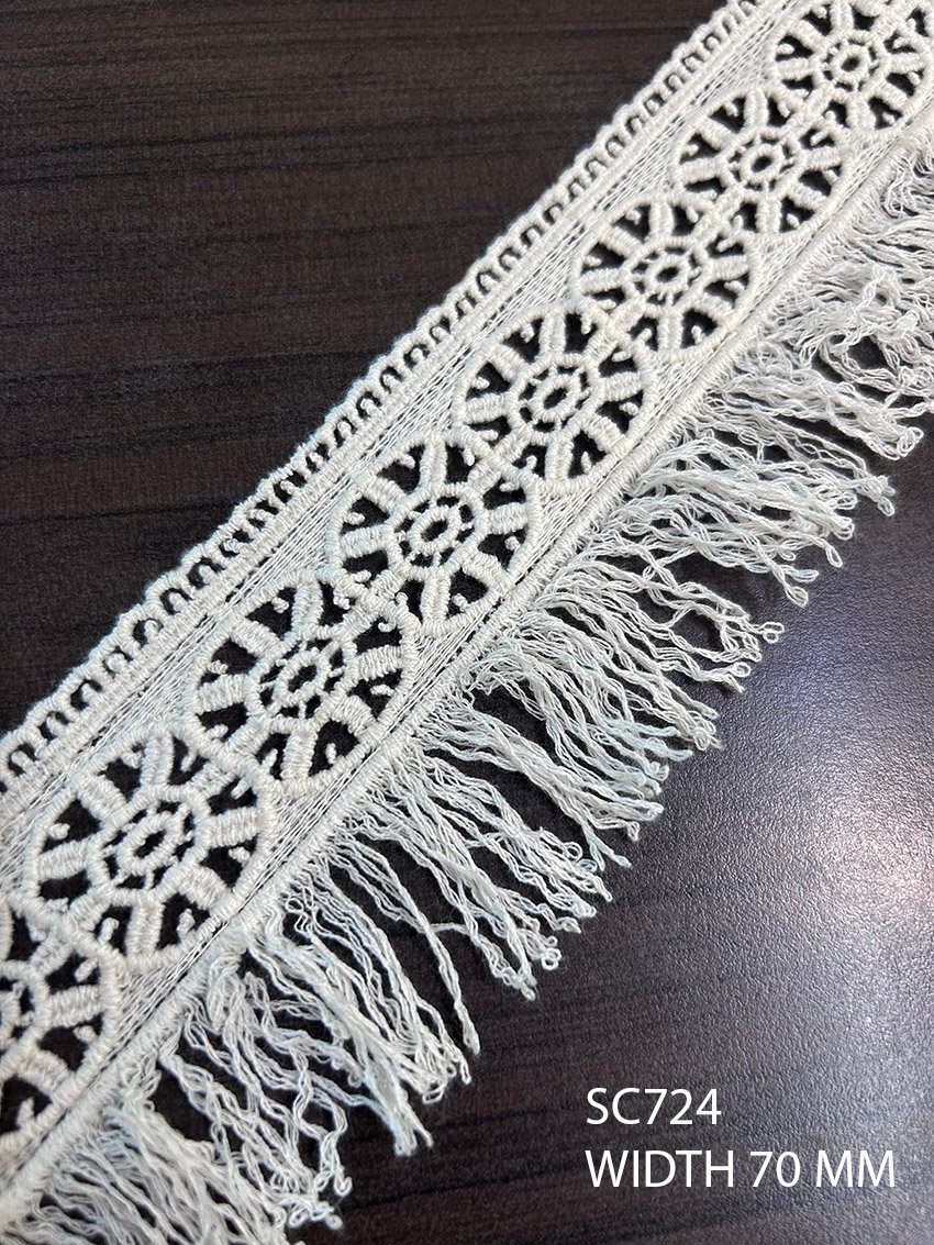 SC724 GPO cotton lace with delicate frills and a 45mm scalloped width. Dyeable and export-grade, ideal for sarees, dupattas, boutique dresses, and couture detailing.