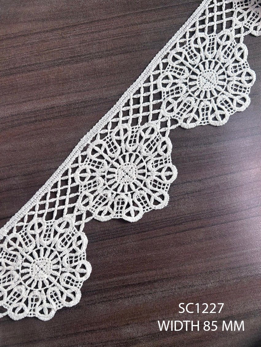 Elegant SC1227 cotton GPO lace featuring a fine weave and 85mm width, perfect for dyeing and custom garment detailing
