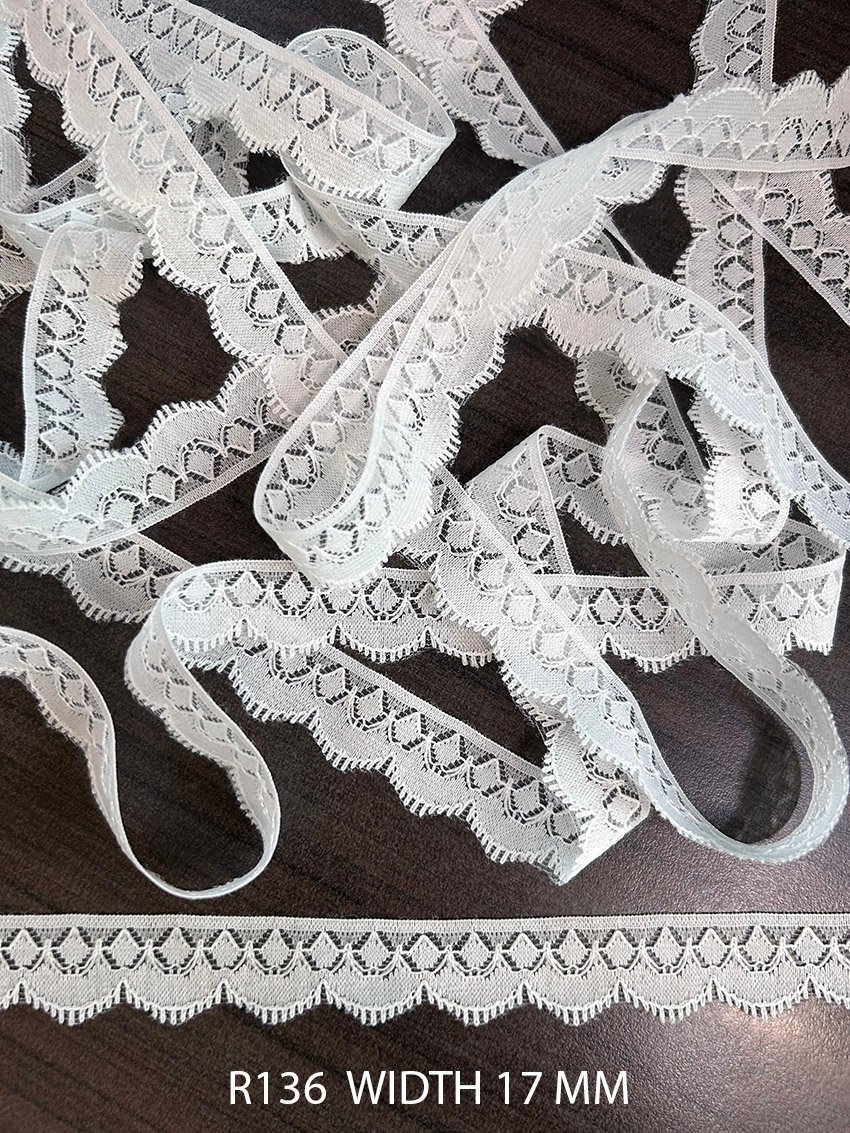 R136 Raschel white nylon lace features a delicate knitted texture with a 17mm width, offering a soft and classy finish. Dyeable and lightweight, this trim is ideal for necklines, sleeves, and couture detailing in kurtis, blouses, and bridal wear.