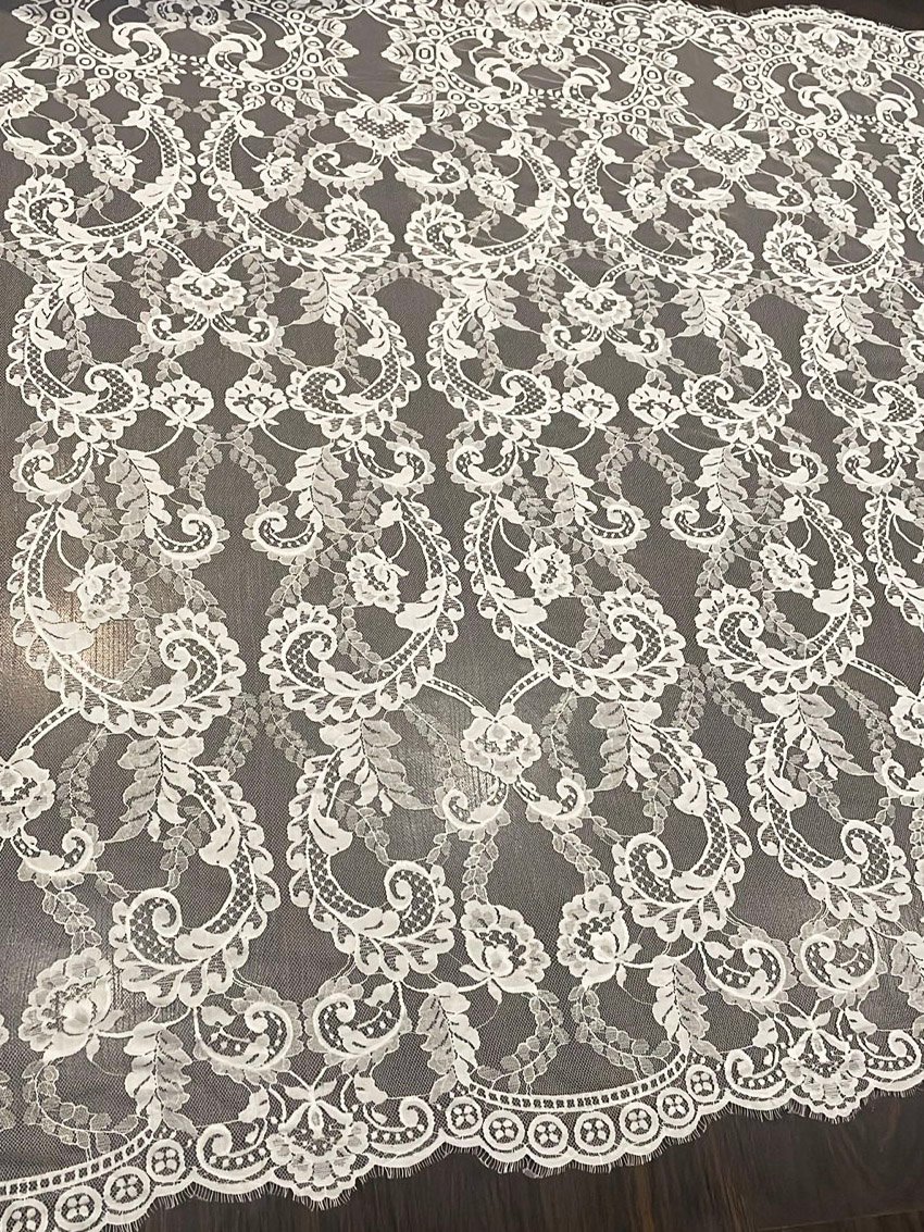 This alternate view of FRE198 showcases its delicate floral embroidery and signature eyelash scallops on a sheer white base. Ideal for bridal overlays, veils, and couture detailing, it offers timeless elegance with a soft drape.