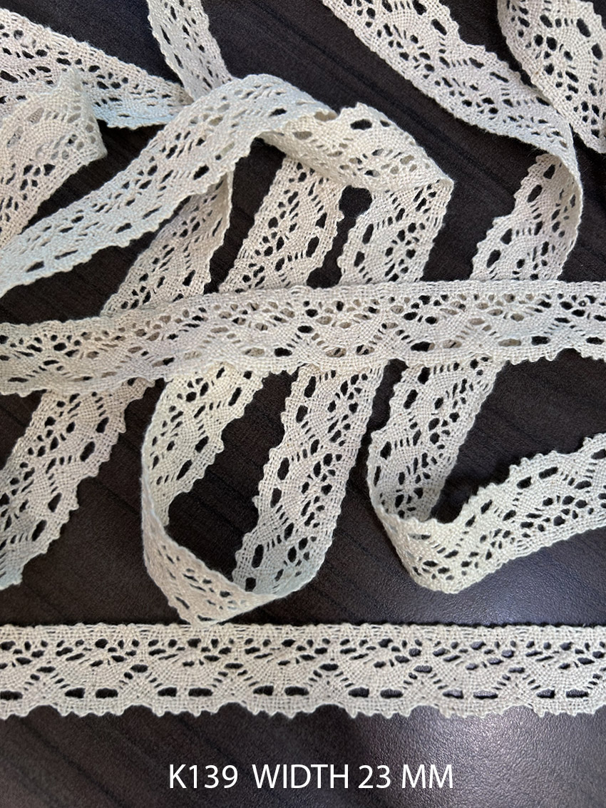 K139 cotton crochet lace in griege finish, dyeable and 23 mm wide for versatile garment applications