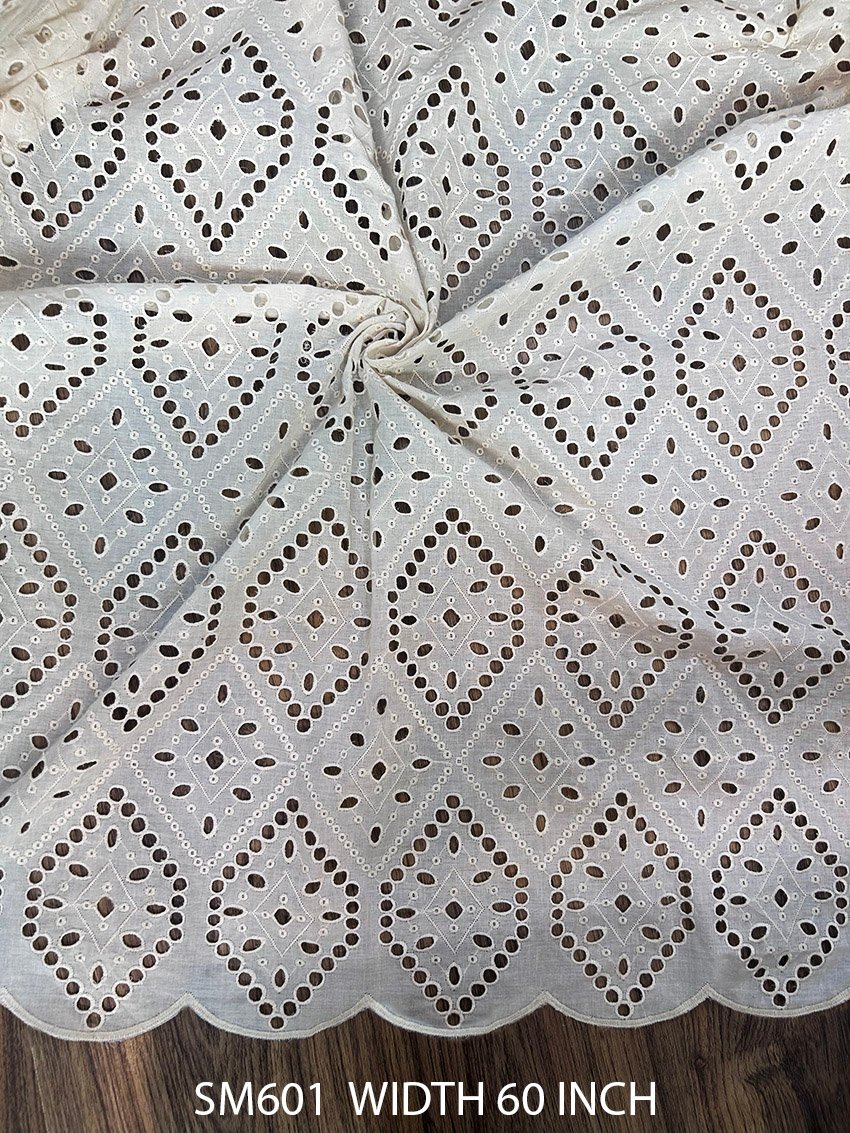 High-quality Cotton Cambric Schiffly embroidery fabric in SM601 dyeable variant. 60-inch width, soft texture, ideal for ethnic and designer wear.