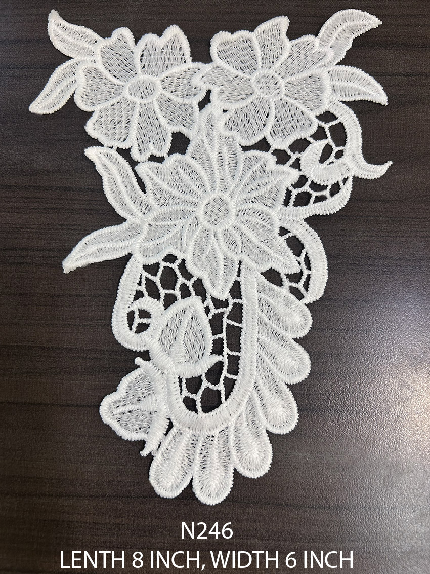 Detailed view of N246 white neck lace patch featuring fine embroidery across an 8×6 inch layout, perfect for neckline enhancement.