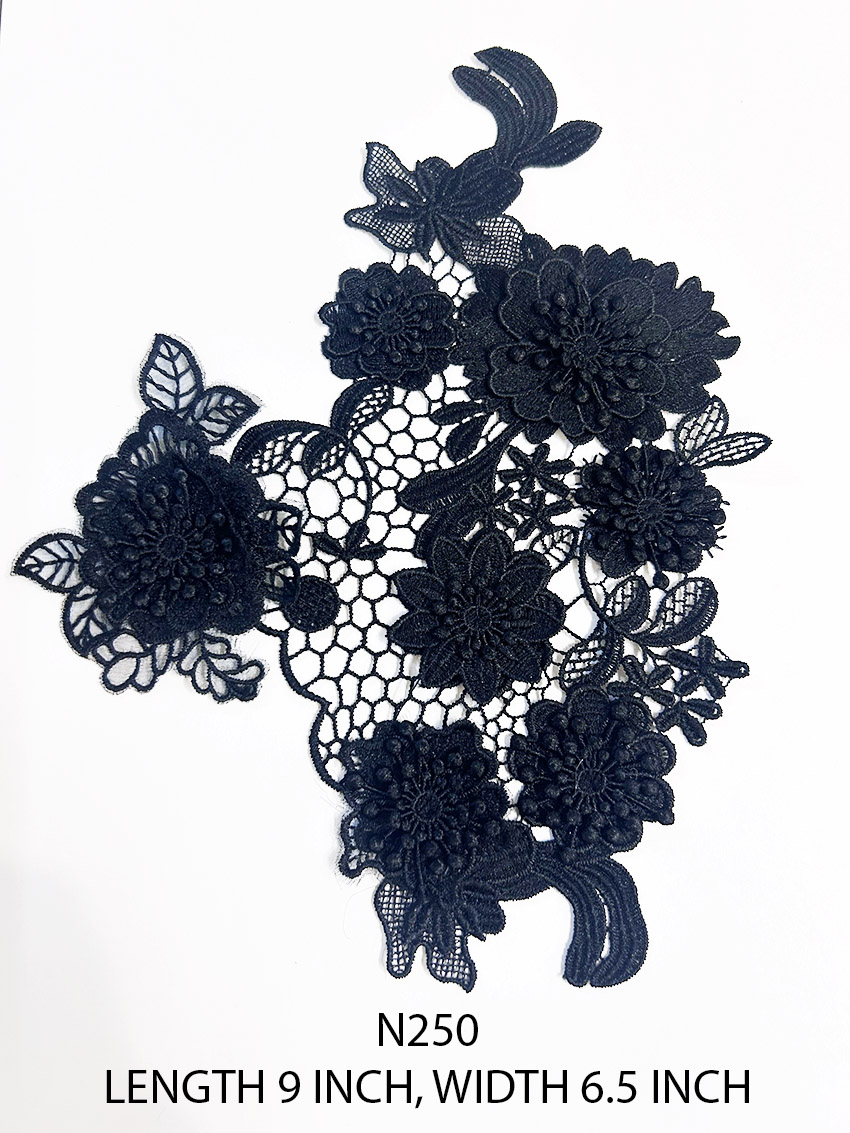 Detailed view of N250 poly lace patch featuring fine embroidery across a 9×6.5 inch layout, available in both white and black for versatile neckline styling.