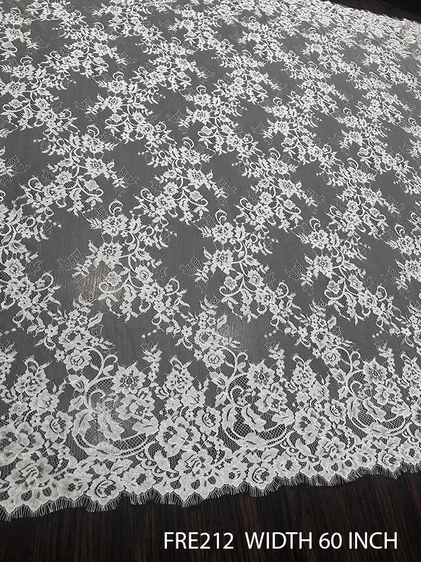 Detailed view of FRE212 white Chantilly lace fabric, showcasing intricate floral patterns across a 60-inch width, supplied in 3-meter