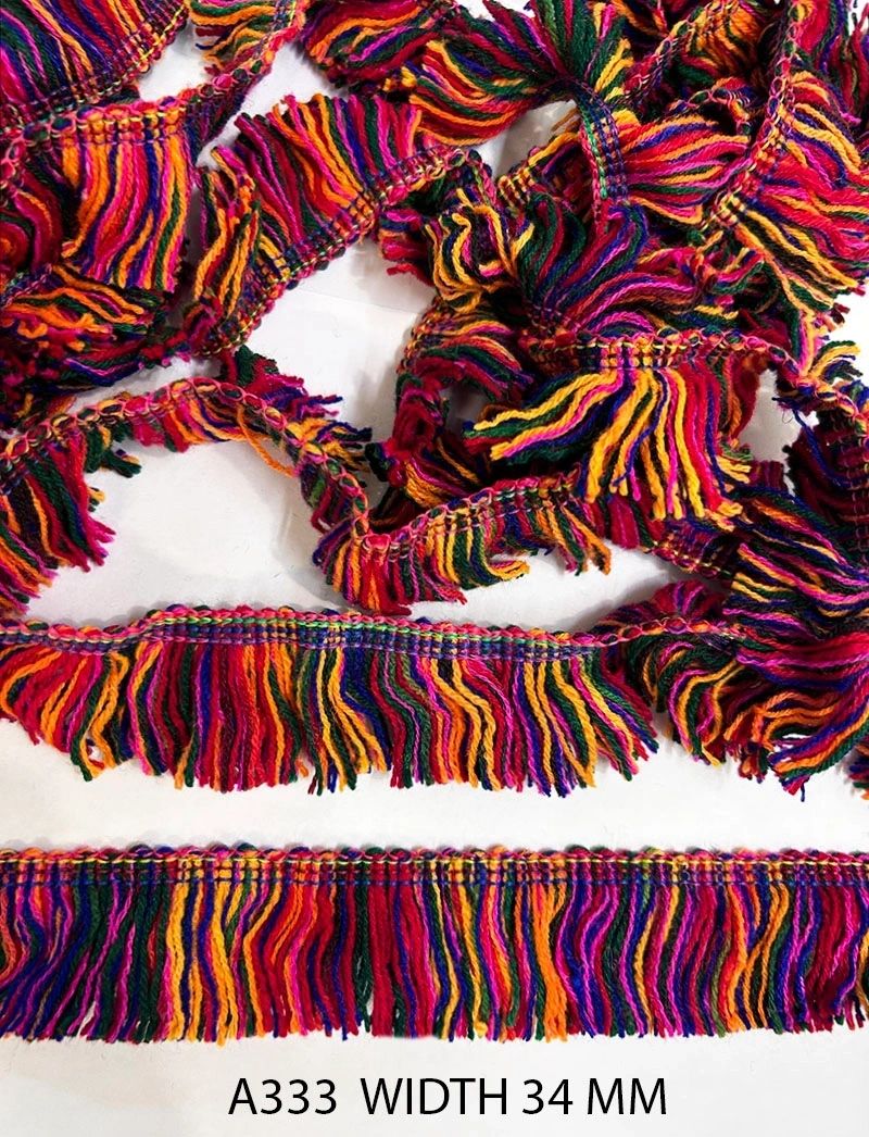 Give your creative projects a bold and artistic flair with the A333 – Multicolor Fringe Lace. This exquisite trim is perfect for enhancing designer garments, home décor items, and craft projects that demand a unique touch of elegance and vibrancy. Featuring eye-catching multicolor tassels seamlessly integrated into a durable lace base, the A333 Fringe Lace marries style and functionality effortlessly.