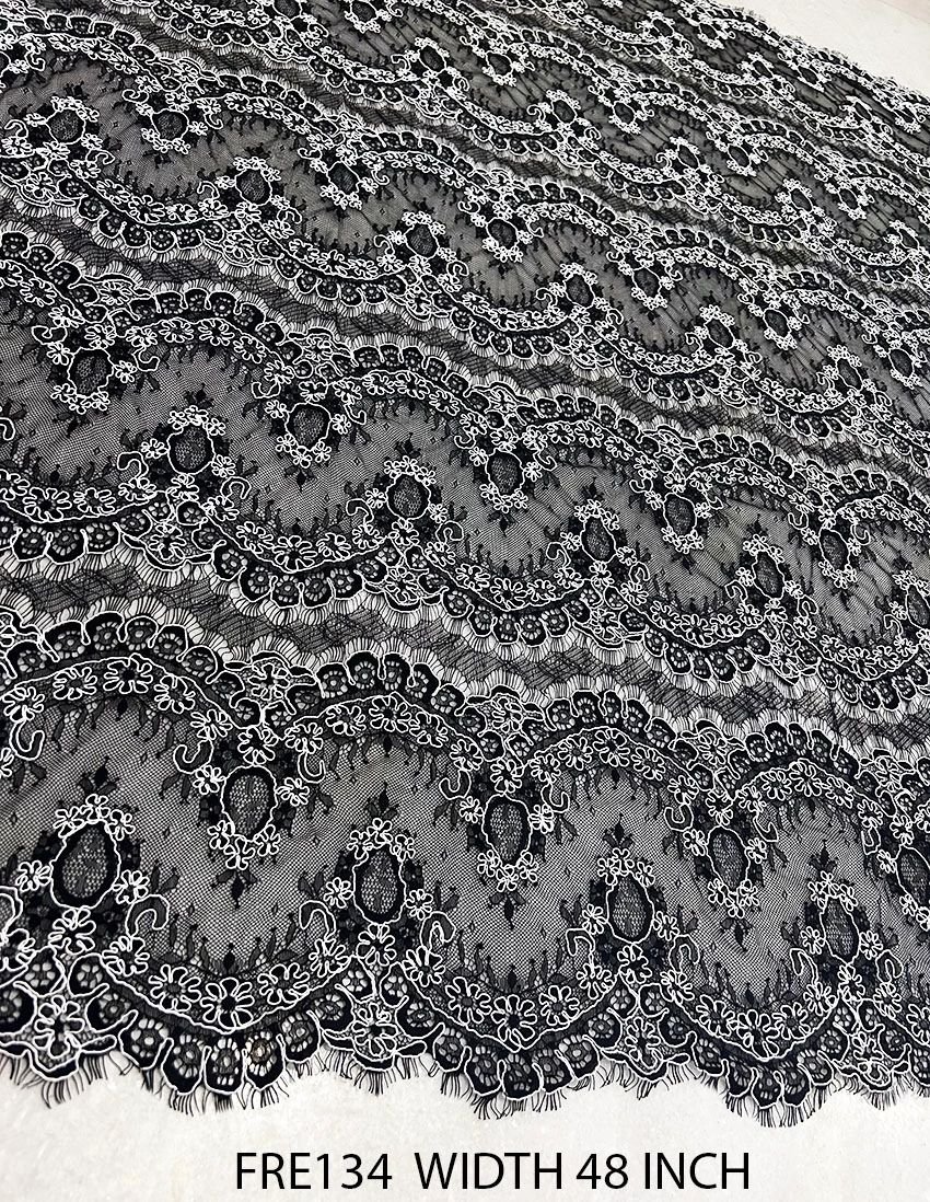 SUPER FINE EYELASH LACE FABRIC BLACK WITH WHITE CORDING YARN