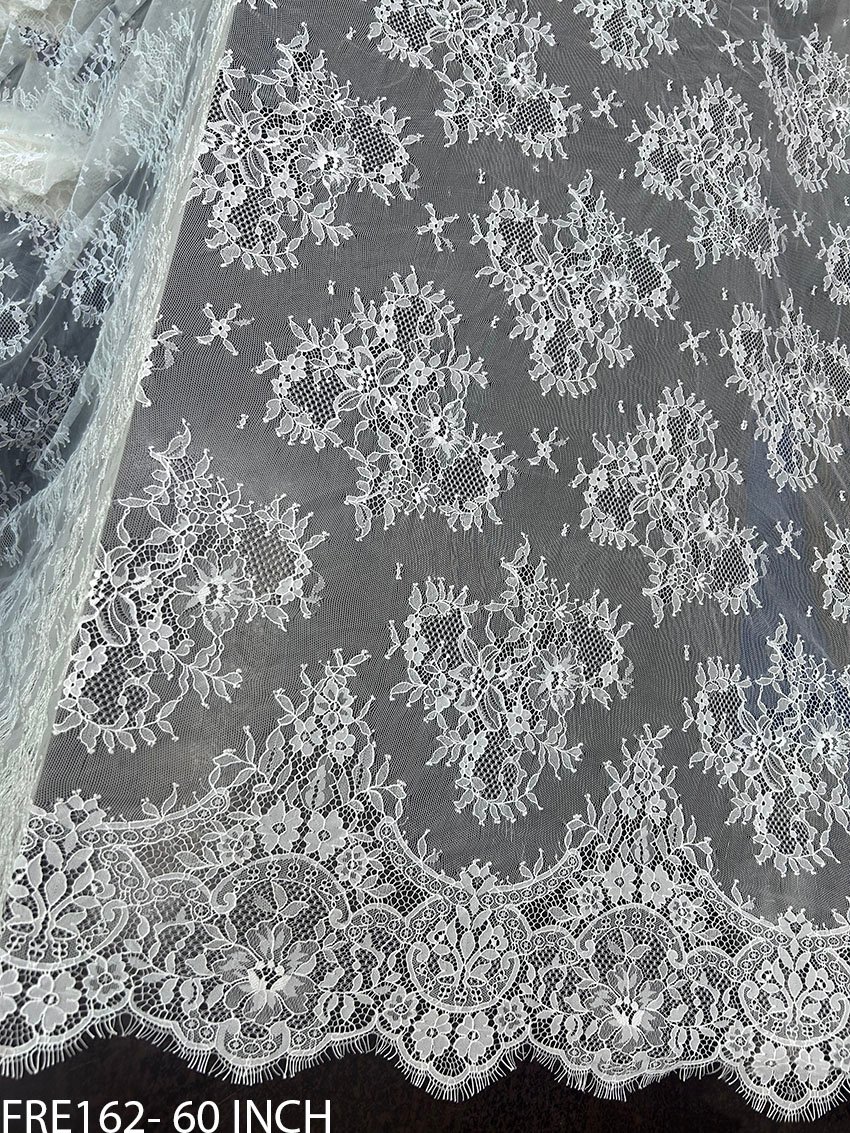 Elevate your bridal or special occasion designs with Chantilly Lace that speaks of elegance and sophistication. Its light feel and delicate structure allow for fluid movement, guaranteeing comfort alongside beauty. This bridal fabric is versatile, making it suitable for not just gowns but also overlays, trims, and even statement pieces for eveningwear. Choose FRE162 Chantilly Eyelash Elegant Lace for your next project and experience the refined quality it offers in every detail.