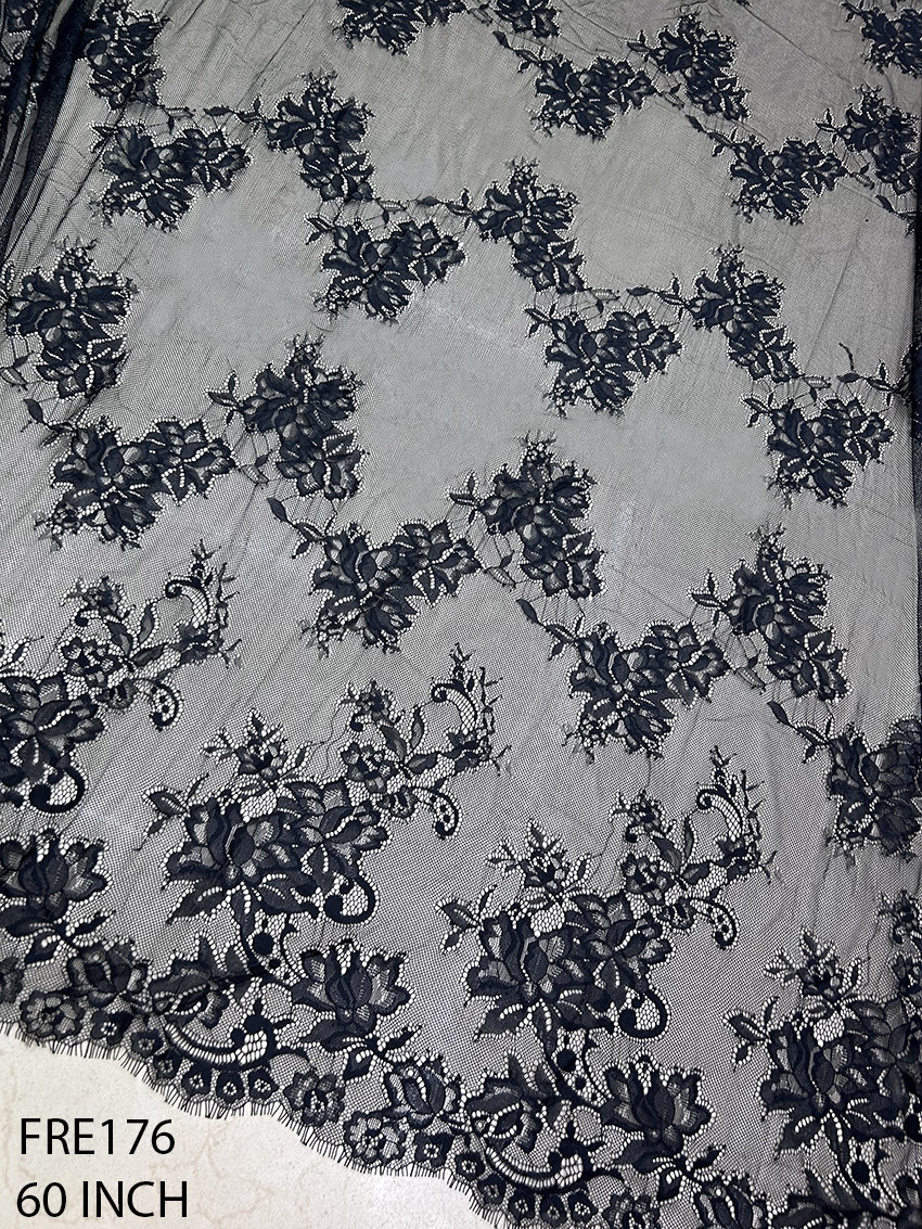 Introducing the FRE176 – Black Chantilly Lace, a premium bridal fabric designed to elevate your couture designs. Perfect for weddings, evening wear, and formal occasions, this luxurious lace brings a touch of timeless elegance to any creation. Crafted with meticulous detail, this fabric is ideal for designers and creators who demand unparalleled quality for their projects.