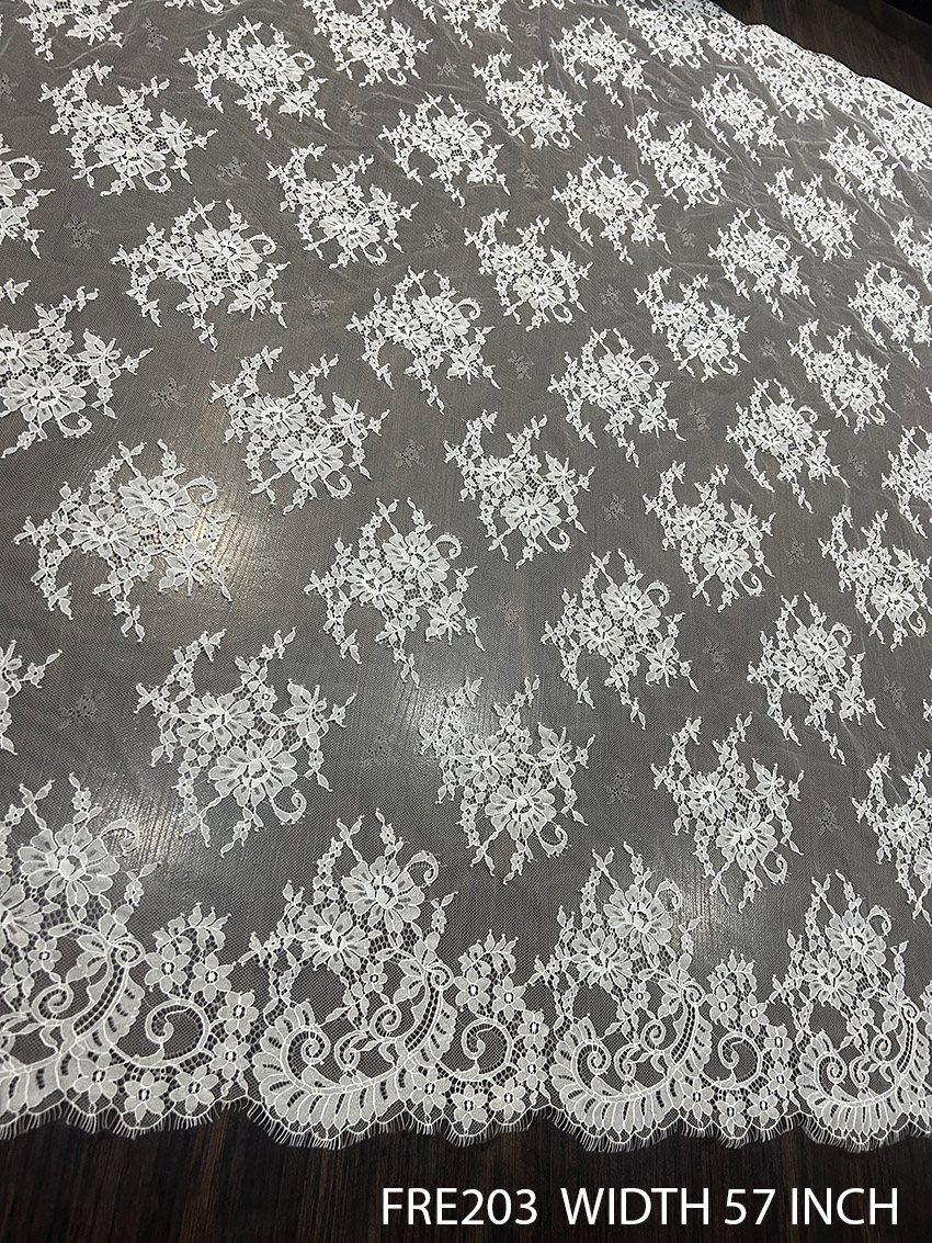Measuring an impressive 57 inches in width, this Chantilly lace offers ample space for intricate design development. Sold conveniently in 3-meter pieces, FRE203 allows designers the flexibility to execute their vision without compromise. Its generous size makes it ideal for larger, flowing garments such as wedding gowns, luxurious veils, or even statement evening attire. The high-quality structure ensures it drapes beautifully while maintaining a lightweight feel, ensuring both comfort and style.