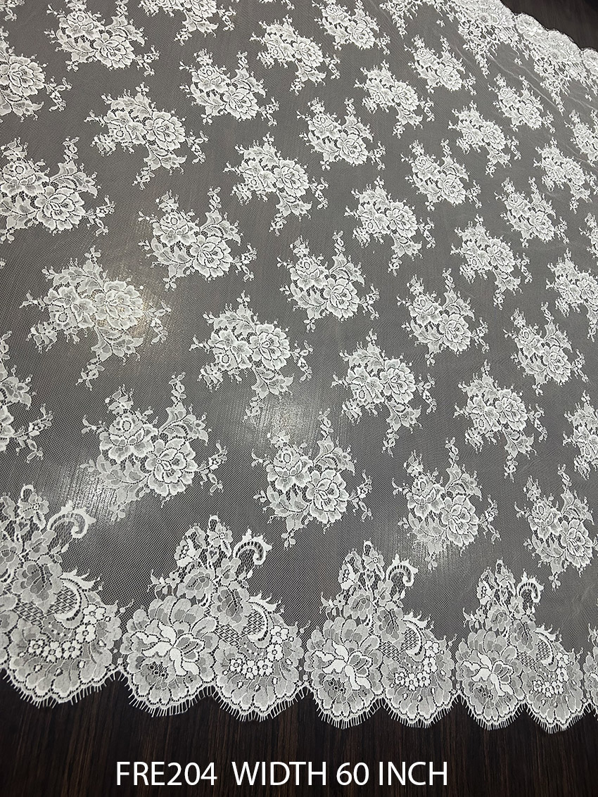 Your bridal designs deserve nothing but the best, and FRE204 delivers on every front. This lace serves as the perfect canvas to create one-of-a-kind silhouettes for weddings and other formal occasions. Its ethereal beauty adds timeless charm while complementing modern and traditional styles alike. Whether you’re designing wedding gowns, veils, or intricate overlays, FRE204 Chantilly lace is your go-to fabric for crafting memorable statements.