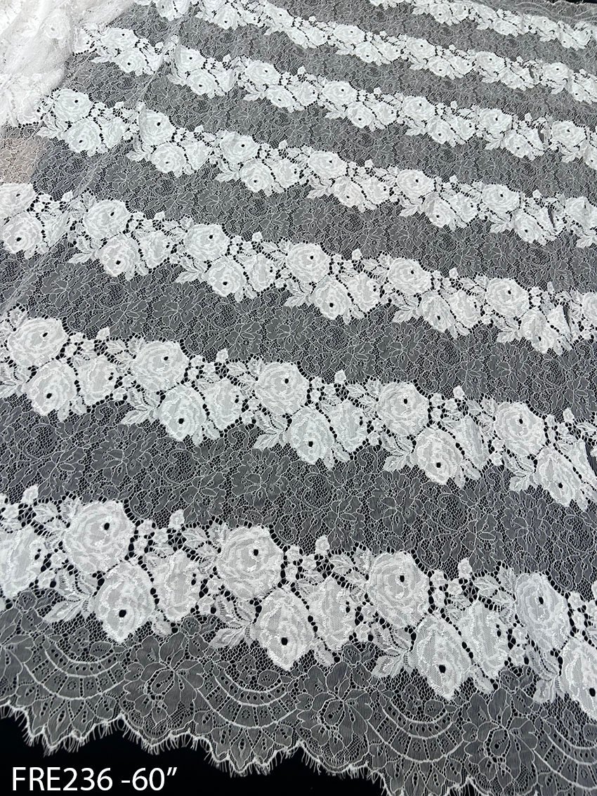 FRE236 Chantilly Eyelash Elegant Lace is designed with versatility in mind. From bridal wear to DIY projects, this fabric empowers creators to bring their visions to life seamlessly. Its generous 60-inch width provides ample fabric for larger designs, while the 3-meter roll ensures you have enough material for detailed craftsmanship without unnecessary waste. The soft texture is easy to work with, making it ideal for both professional designers and hobbyists exploring new creations.