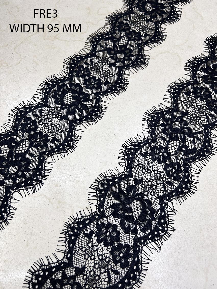 Bring the beauty and sophistication of the Fre3 Chantilly Eyelash Black Lace into your next project and see the difference it makes. With 3 meters in every roll and 95mm width, this lace provides the perfect combination of style, quality, and quantity to spark your creativity.