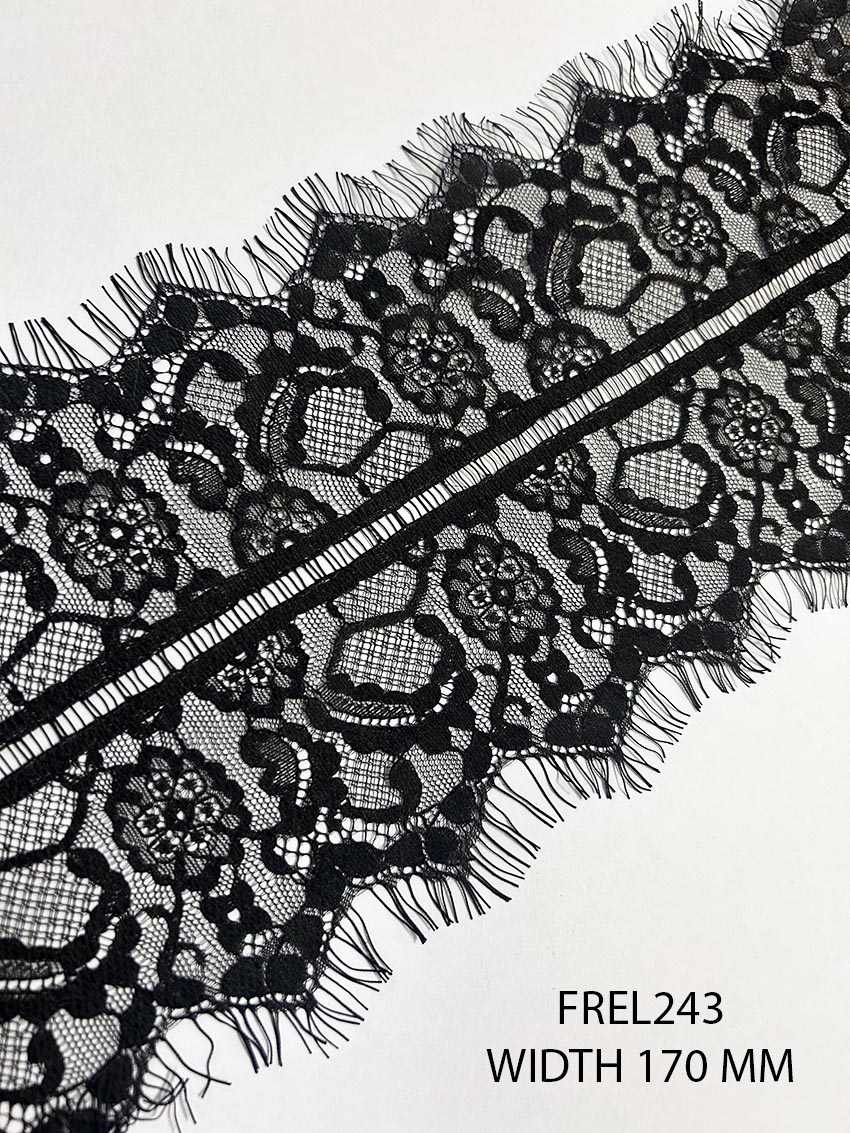 Add a touch of sophistication and luxury to your creations with the exquisite black Chantilly eyelash lace, design number FREL243. Crafted to perfection, this premium lace stands out with its delicate detailing and ultra-soft texture, making it an ideal choice for anyone looking to create timeless garments. The refined design is perfect for accentuating the elegance and charm of occasions requiring couture-inspired clothing.