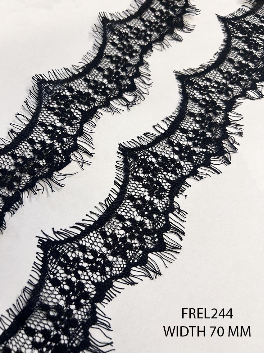Introducing the exquisite design number FREL244, high-quality fine black Chantilly lace that embodies elegance and refinement. This premium lace is thoughtfully crafted with detailed patterns and a soft, delicate texture that makes it a versatile choice for fashion-conscious creators. Whether designing stylish blouses, glamorous gowns, or unique designer garments, this Chantilly lace adds a distinct touch of sophistication to every piece.