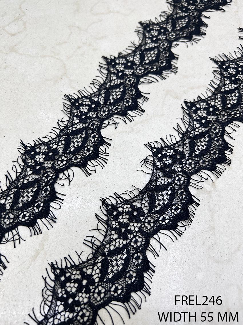 Discover the timeless beauty of our premium fine small cute black Chantilly lace design, number FREL246. Designed to impress, this lace features intricate and elegant detailing, making it the perfect choice for adding charm and sophistication to any outfit or craft project.