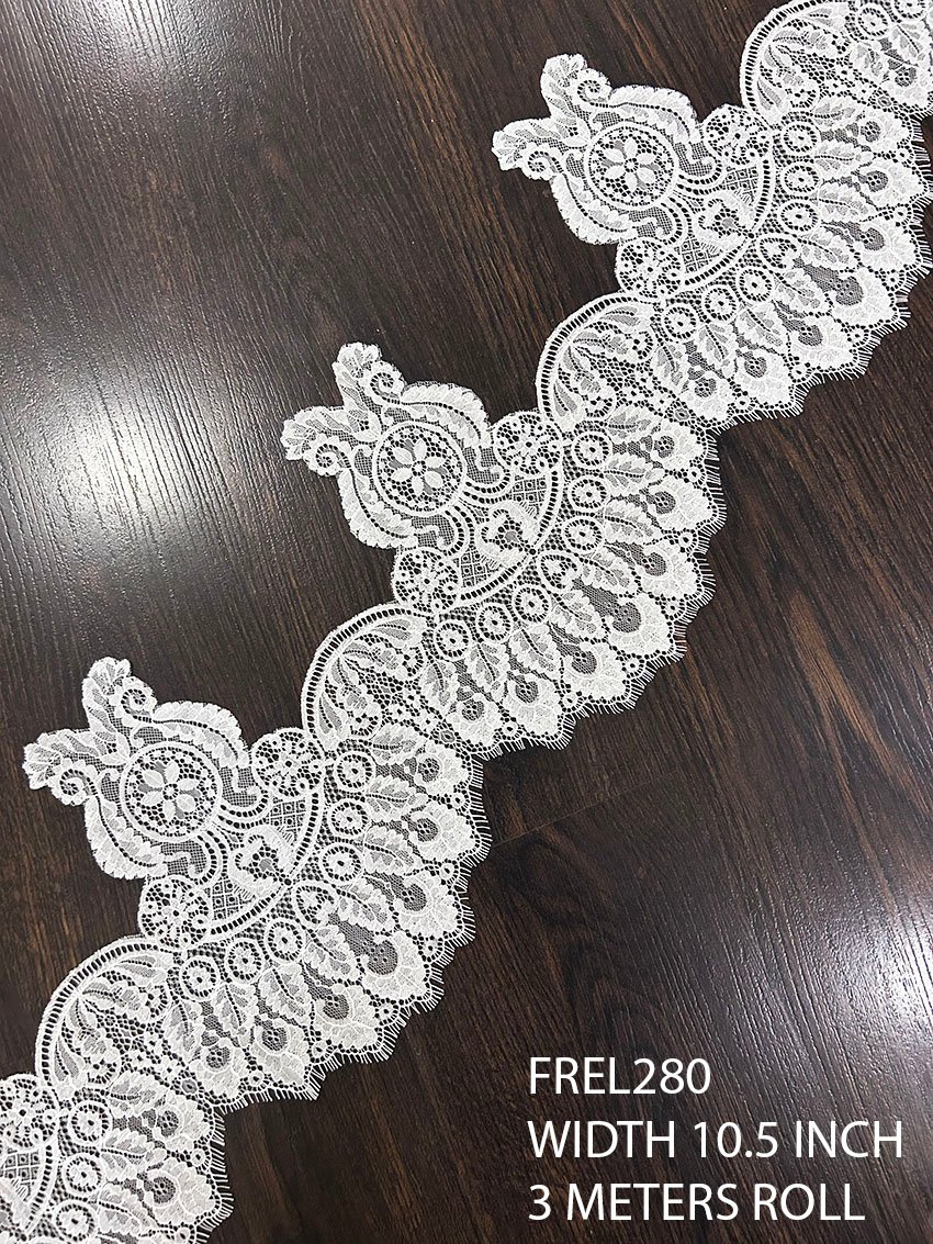 The FREL280 premium export quality white Chantilly eyelash lace trim is the ideal choice for designers seeking sophisticated elegance. Crafted with a stunning floral pattern and soft finish, this lace embodies both beauty and comfort. Measuring an impressive 10.5 inches in width, it offers ample material for intricate and versatile designs, making it perfect for high-end fashion projects.
