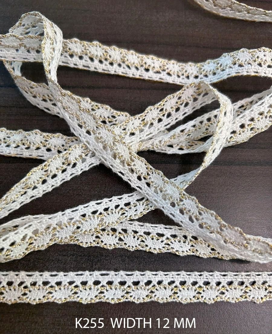 WHITE AND GOLD LUREX CROCHET LACE WIDTH 12 MM PRICE PER METER DYEABLE EXPORT QUALITY