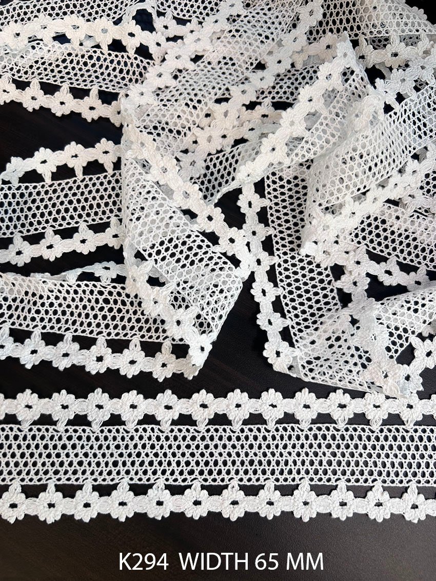 Add a delicate handmade charm to your garments with our K294 white cotton crochet lace. This lace features beautiful floral crochet motifs on both sides with a breathable net pattern in the center, giving it a classic vintage look.