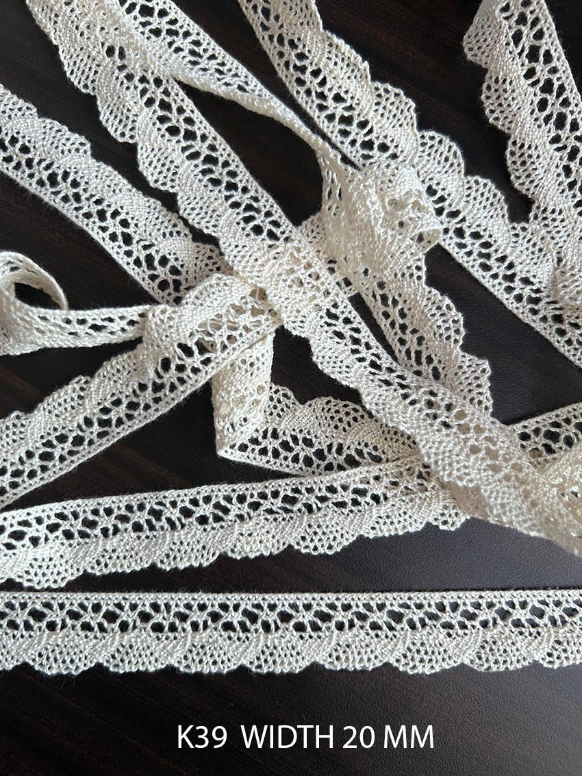 Elevate your crafting and sewing projects with the K39 Cotton Crochet Premium Lace. Made from 100% pure cotton, this timeless 20mm lace trim is not only durable but also ultra-soft to the touch. Designed to meet the needs of DIY enthusiasts and professional designers alike, this lace is perfect for a wide range of uses, from garment embellishments to home décor enhancements.