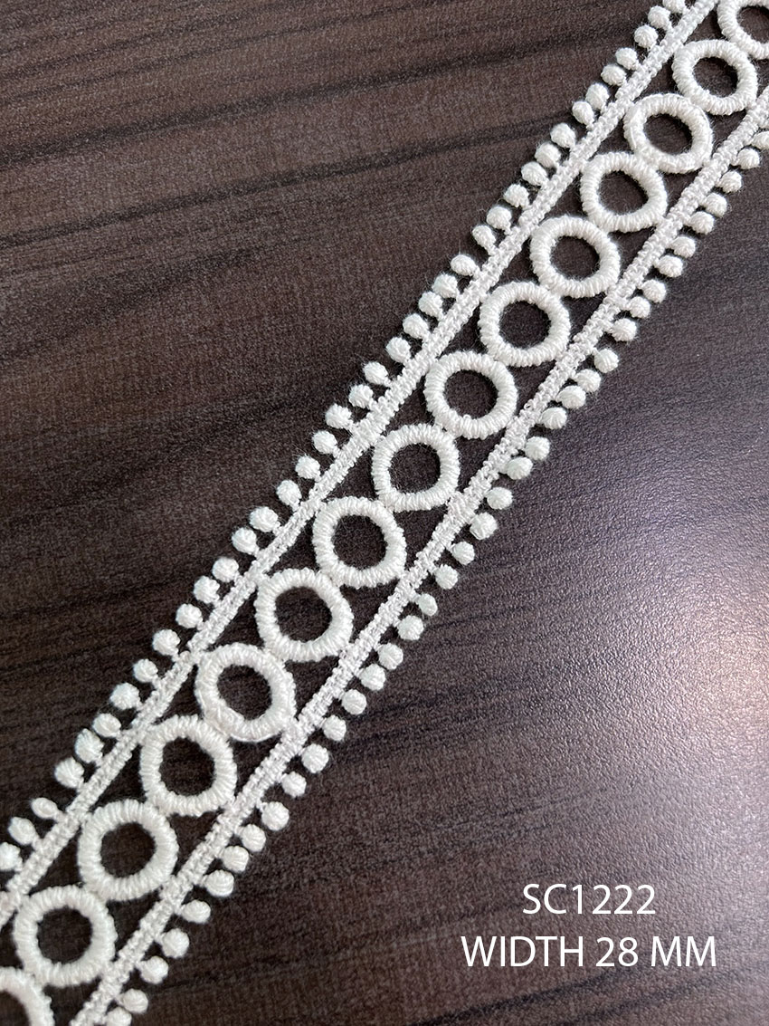 The SC1222 cotton GPO lace offers an exquisite combination of elegance and functionality. With a width of 28mm, it features intricate chemical embroidery that enhances the beauty of any garment. Crafted with precision, this lace is perfect for adding a touch of sophistication to sarees, dupattas, boutique dresses, and more.