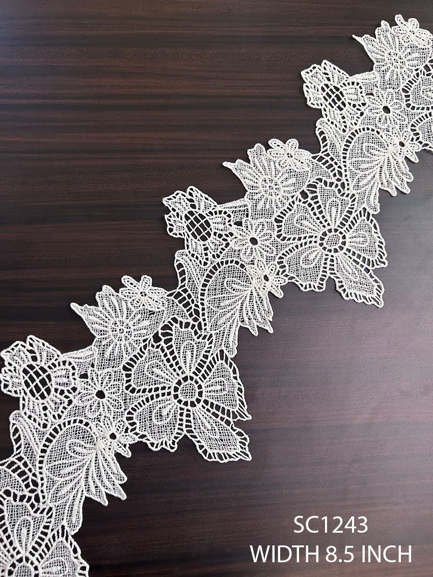 Introducing the SC1243 White Cotton GPO Chemical Flower Lace, a perfect blend of elegance and functionality. This exquisite 8.5-inch lace is meticulously crafted from high-quality cotton, offering an intricate floral design that radiates sophistication. Its dyeable nature ensures it can be customized to suit any project, making it an essential addition to your crafting or design toolbox.