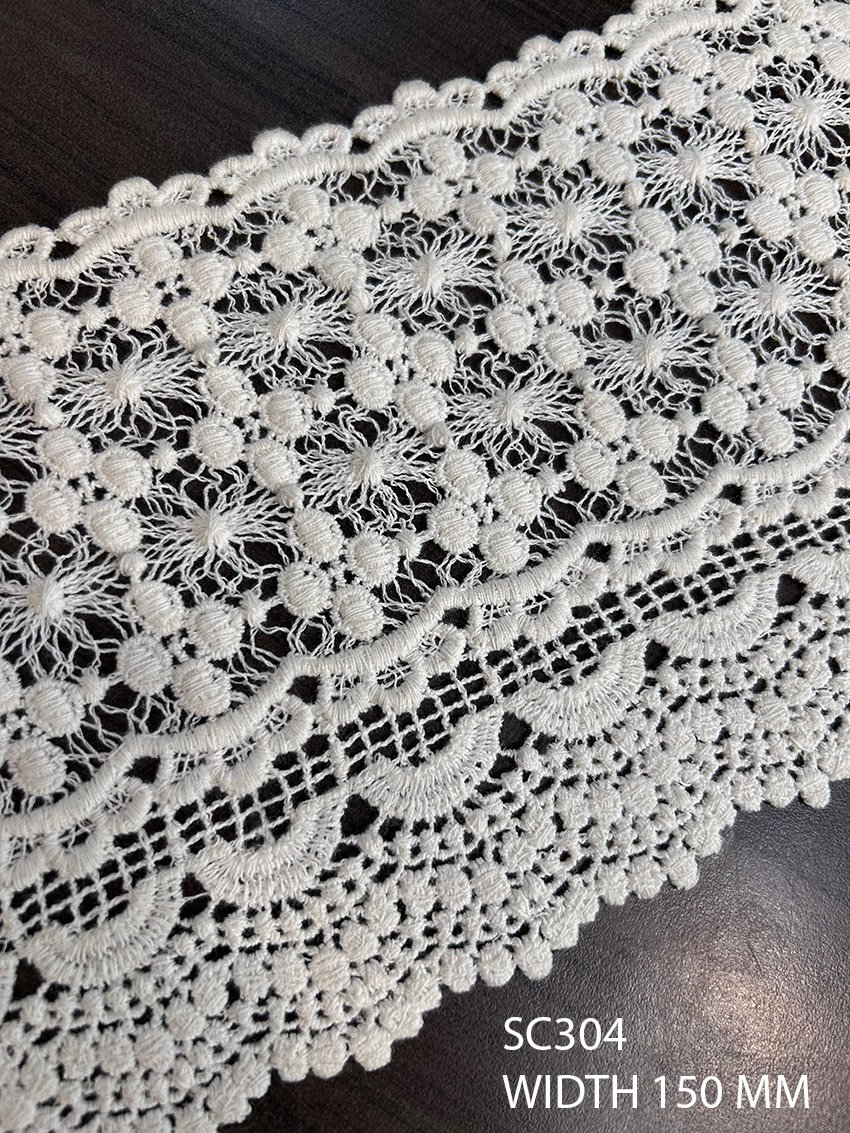 The SC304 lace trim is specially designed to empower creative minds. Its dyeable cotton material ensures you can effortlessly match it to your desired color palette, allowing you to blend or contrast beautifully with any fabric. Whether you’re working on bridalwear, costume design, or bespoke fashion, this trim is the ultimate solution for adding finesse and detail to your projects.