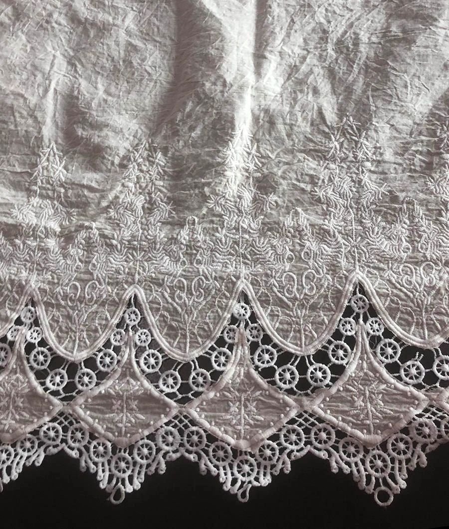 Chemical Laces FABRIC SINGLE SIDE SCALLOP ON PLAIN FABRIC MILK SILK POLY WHITE ON GREIGE FABRIC WIDTH 40 INCHES EXPORT QUALITY PRICE PER METER˜
