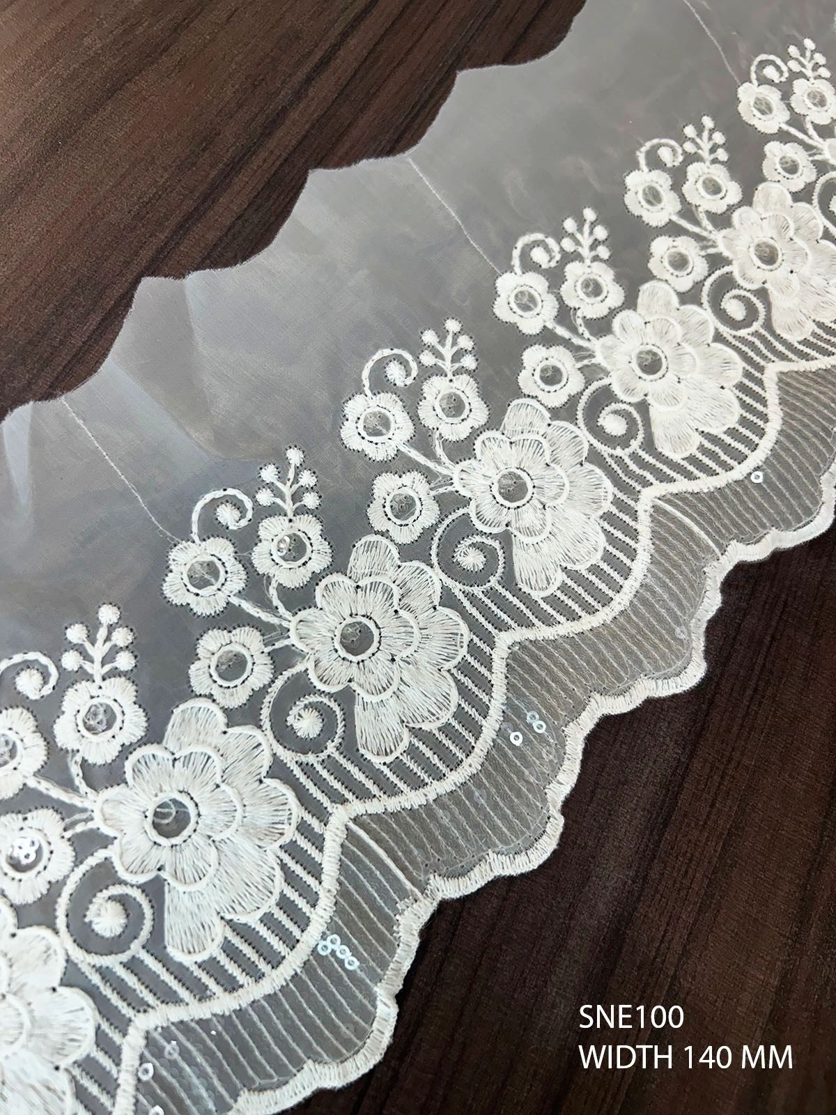 POLY WHITE EMBROIDERY ON ORGANZA MESH NET WITH TRANSPARENT SEQUENCE WIDTH 140 MM PRICE PER METER EXPORT QUALITY