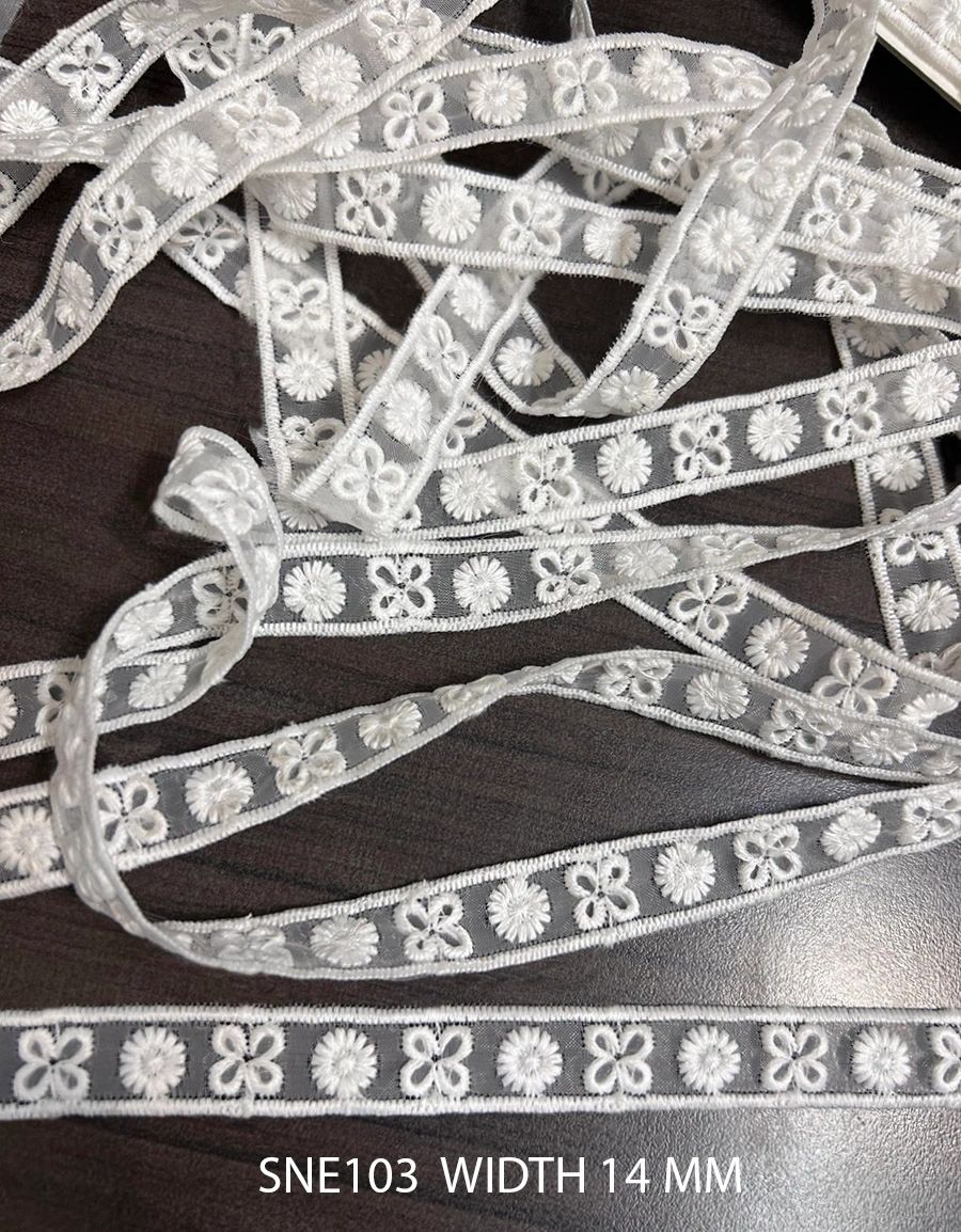 POLY WHITE EMBROIDERY ON ORGANZA MESH NET WIDTH 14 MM PRICE PER METER EXPORT QUALITY