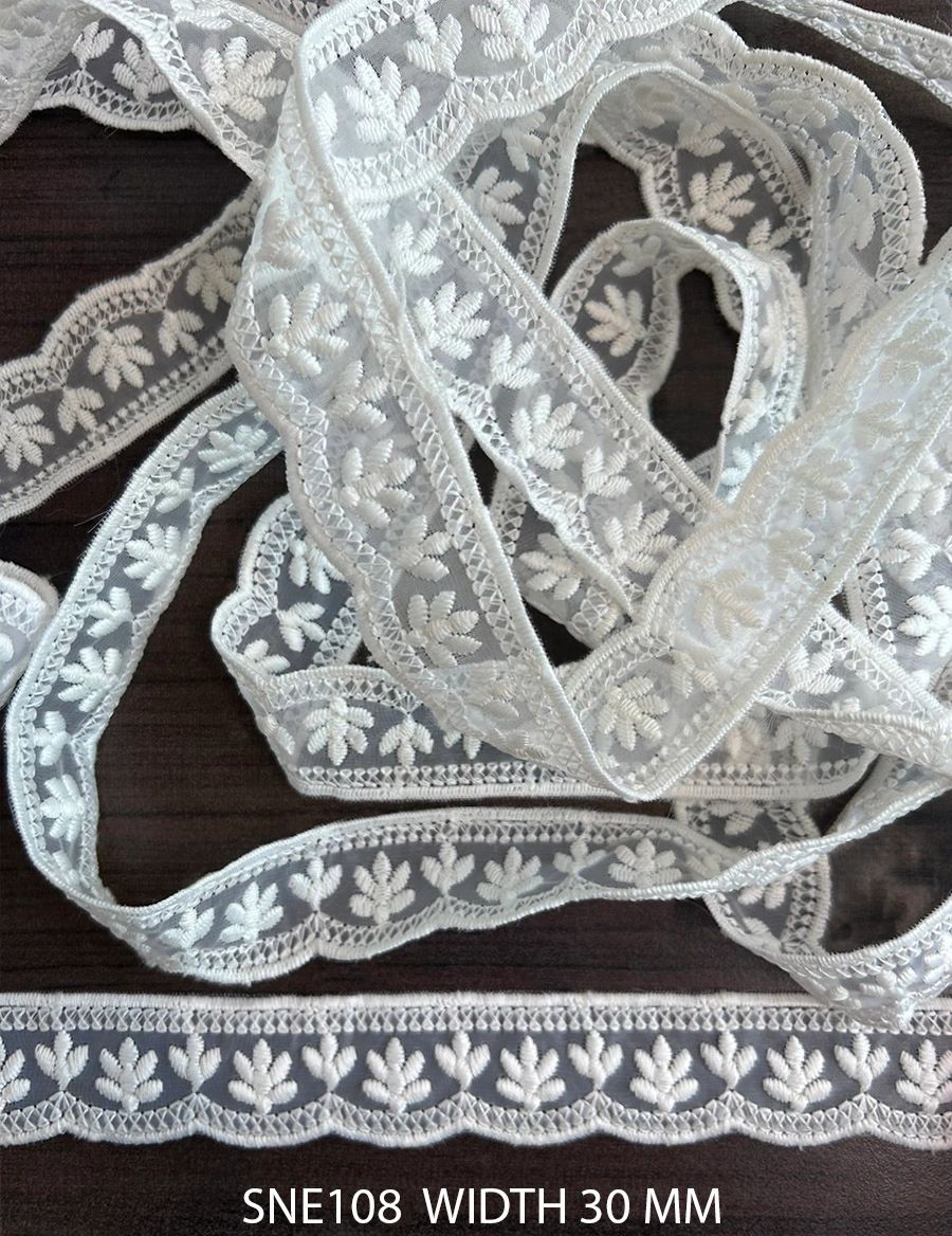 POLY WHITE EMBROIDERY ON ORGANZA MESH NET WIDTH 30 MM PRICE PER METER EXPORT QUALITY