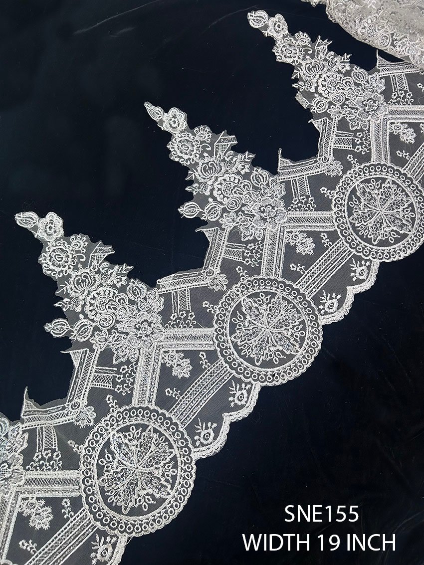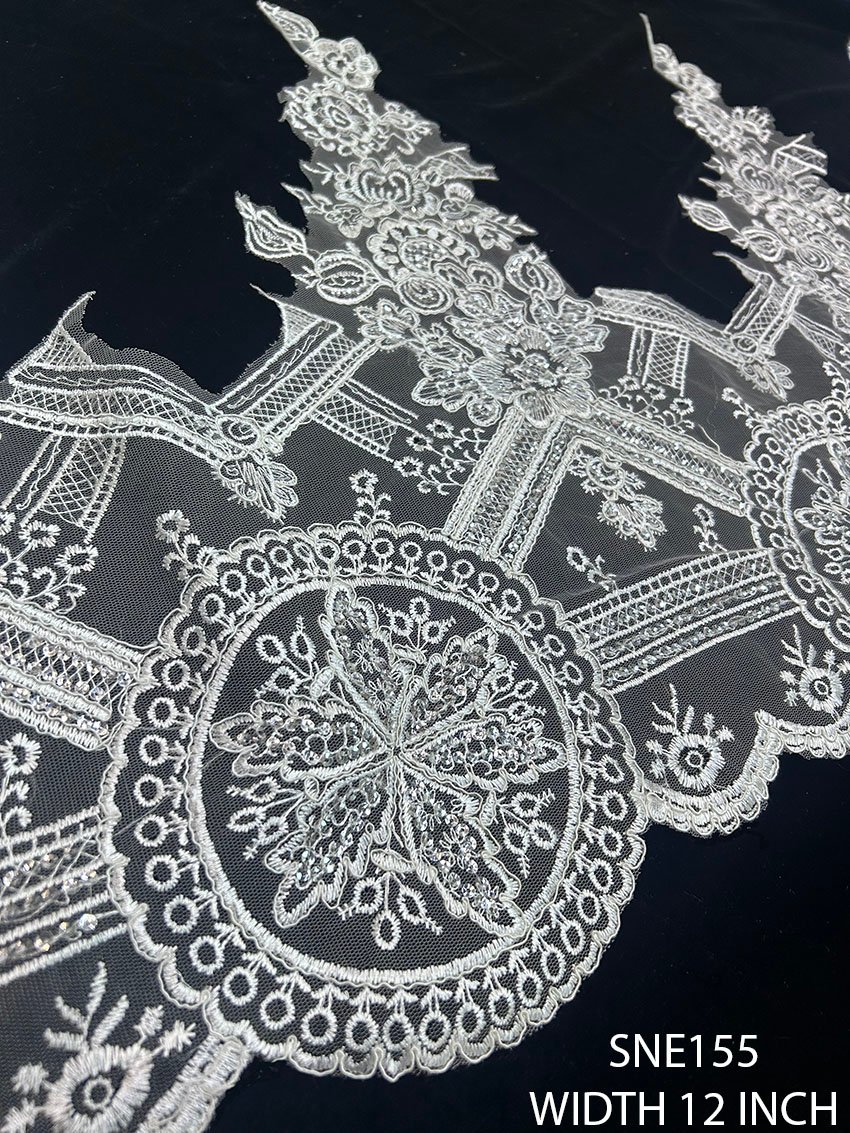 Flexibility is key, which is why the SNE155 lace is sold per meter, allowing you to purchase the exact quantity you need for your project. Whether you require a small amount for a delicate hemline or a larger length for an elaborate gown, you can customize your purchase to suit your unique design needs and preferences.