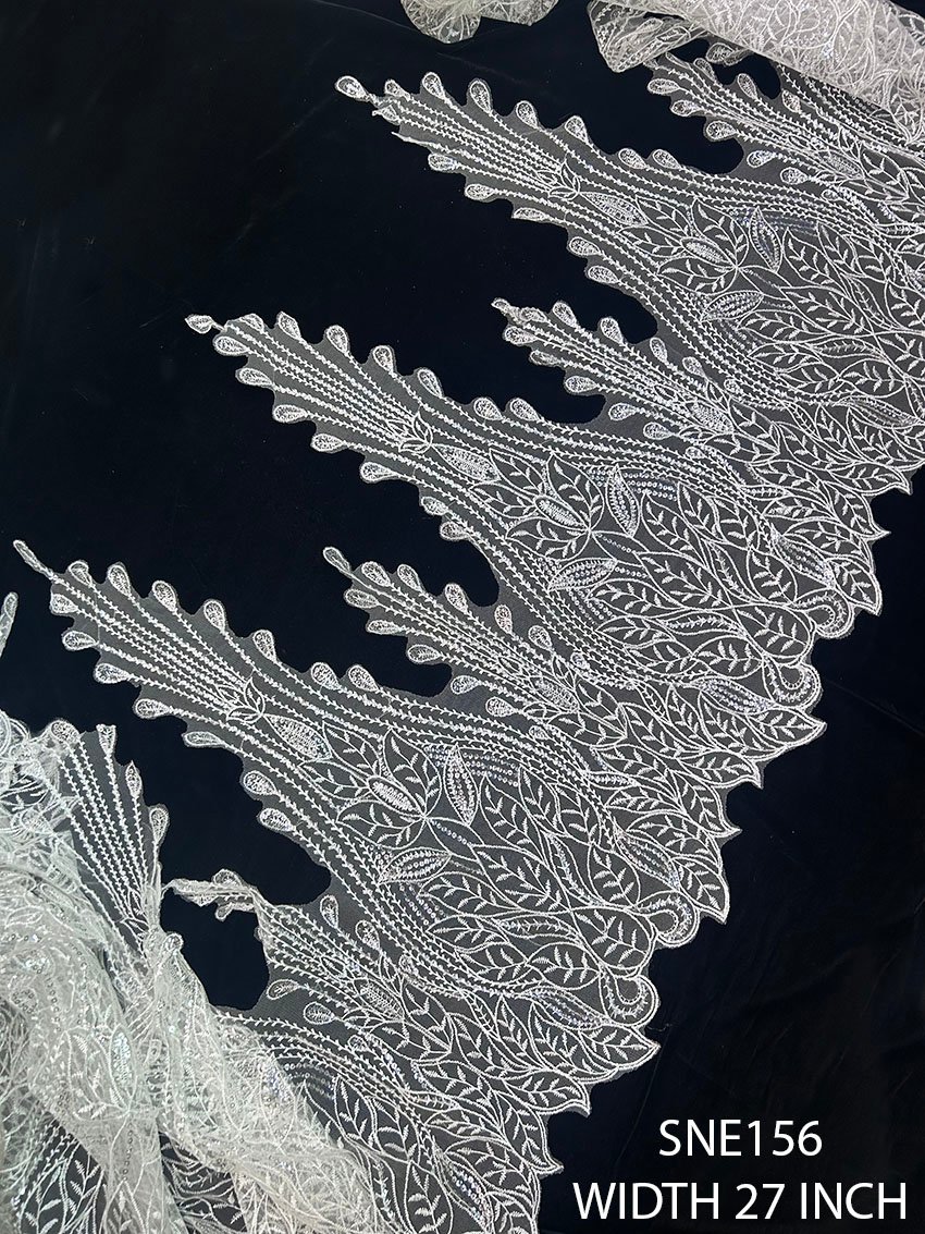 Elevate your wedding or special occasion attire with the SNE156 luxurious bridal lace. Crafted from premium net fabric, this exquisite lace boasts heavy embroidery, intricate cording, and sequin detailing. It delivers unparalleled glamour, making it the perfect choice for enhancing lehengas, gowns, dupattas, or other bridal and festive garments.