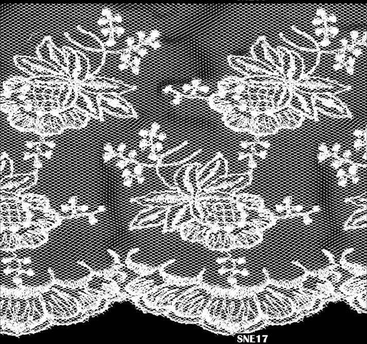 ˜COTTON GREY EMBROIDERY ON MESH NET˜ EMBROIDERY WIDTH 88MM ALL PRICES IN METERS SAMPLING PRICE DYEABLE EXPORT QUALITY