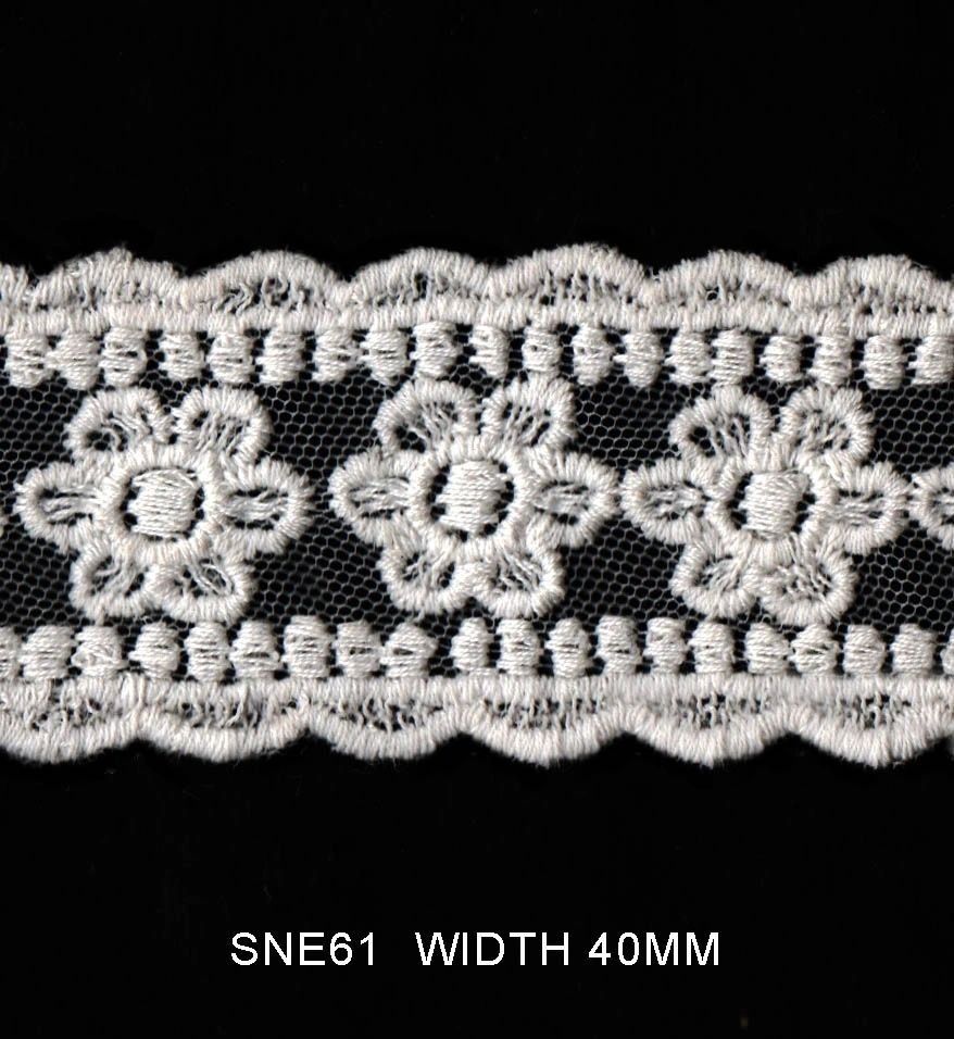 COTTON WHITE EMBROIDERY ON MESH NET EMBROIDERED WIDTH 40MM TOTAL WIDTH 40MM PRICE PER METER DYEABLE EXPORT QUALITY
