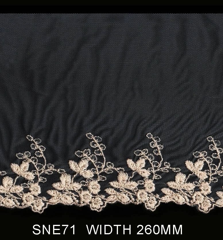 COTTON EMBROIDERY ON MESH NET EMBROIDERED WIDTH 65 MM TOTAL WIDTH 260 MM PRICE PER METER DYEABLE EXPORT QUALITY