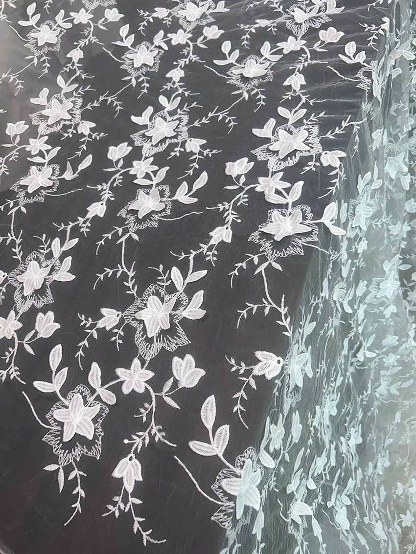 3D FLORAL NET EMBROIDERY POLY WHITE ORGANZA FABRIC